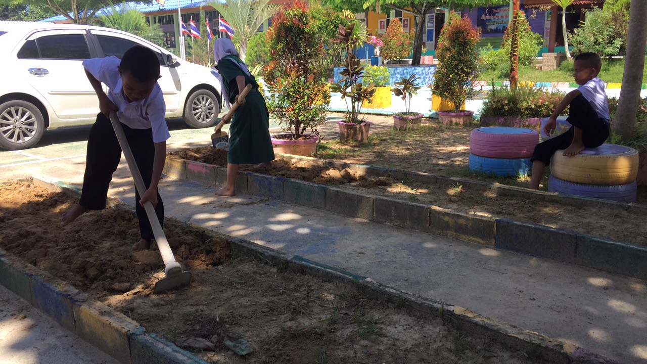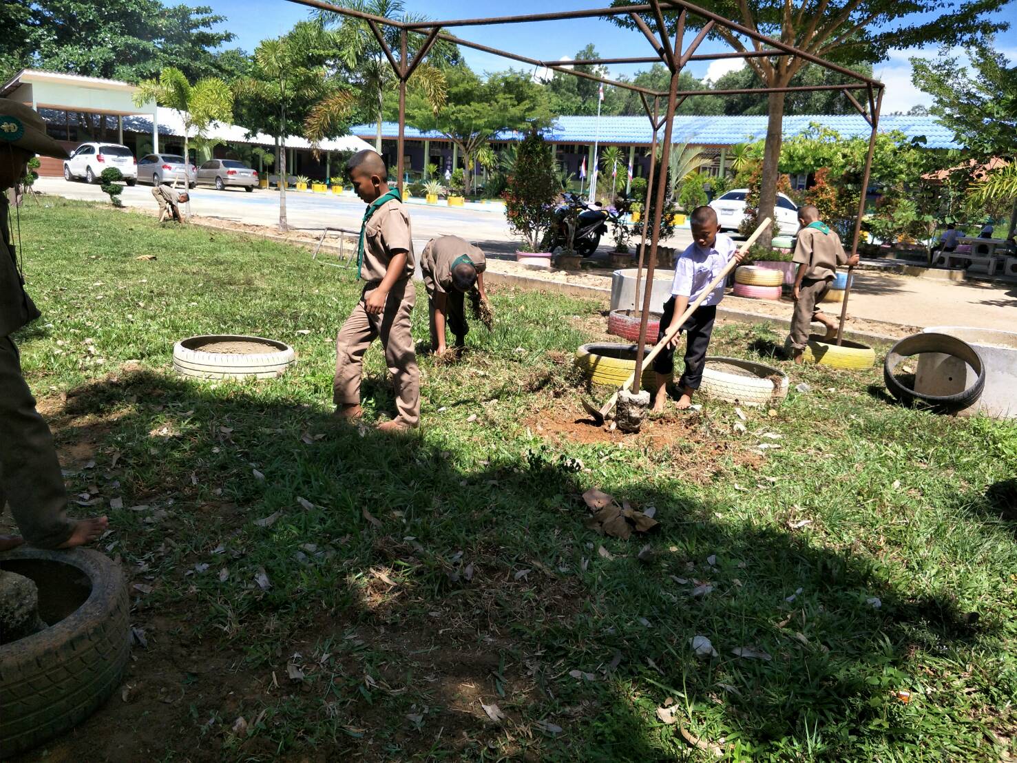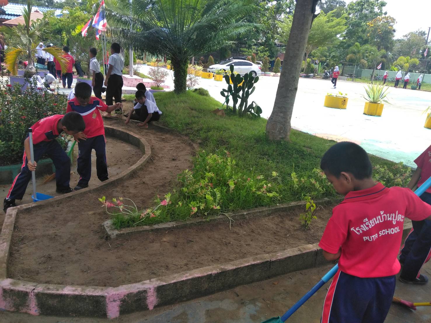 ผอ.รร. ครู นักเรียน โรงเรียนบ้านปูตะ และ ทหาร ช่วยกันเตรียมพื้นที่การเพาะปลูกพืชผักภายในโรงเรียน (ลดเวลาเรียน เพิ่มเวลารู้)