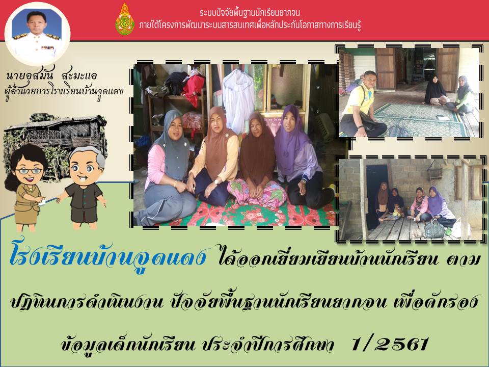 คณะครูโรงเรียนบ้านจูดแดง ได้ออกพื้นที่เยี่ยมเยียนนักเรียน เพื่อคัดกรองข้อมูลนักเรียน ปัจจัยพื้นฐานนักเรียนยากจน ประจำปีการศึกษา 2561