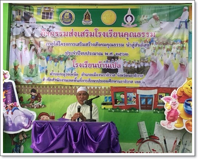 โรงเรียนบ้านเปล ได้รับการจัดสรรงบประมาณสนับสนุนจากสำนักงานวัฒนธรรมจังหวัดนราธิวาส เพื่อดำเนิน โครงการเสริมสร้างสังคมคุณธรรมบนพื้นฐานความหลากหลายทางวัฒนธรรม กิจกรรมส่งเสริมโรงเรียนคุณธรรม ประจำงบประมาณ พ.ศ. ๒๕๖๒ โดยมีวัตถุประสงค์เพื่อให้โรงเรียนคุณธรรมได้แลกเปลี่ยนความคิดเห็นในการปฏิบัติตน ให้กับนักเรียนและ ประชาชนได้น้อมนำหลักปรัชญาของเศรษฐกิจพอเพียง มาเป็นหลัก ในการพัฒนาคุณภาพชีวิตให้สามารถดำเนินชีวิตอย่างมั่นคง และเพื่อให้มีการดำรงชีวิตตามวิถีวัฒนธรรมไทย มีความเอื้ออาทร มีขนมธรรมเนียม ประเพณี ที่ดีงามของไทยและมีการถ่ายทอดภูมิปัญญาของท้องถิ่นสู่การปฏิบัติในชีวิตประจำวันของคนไทย โดยทางคณะครูผู้รับผิดชอบโครงการ ได้เชิญ นายอับดุลลาเต๊ะ สาและ อิหม่ามมัสยิดบ้านเปล เป็นวิทยากร บรรยายเรื่อง คุณธรรม จริยธรรม นำสู่สันติ ให้กับผู้เข้าร่วมอบรม ซึ่งมีกลุ่มเป้าหมาย ประกอบด้วยคณะครู ผู้ปกครองและนักเรียนชั้นประถมศึกษาปีที่ ๑ ๖ ในวันศุกร์ที่ ๘ กุมภาพันธ์ ๒๕๖๒ ณ อาคารเอนกประสงค์ โรงเรียนบ้านเปล