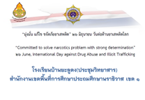 26 มิถุนายน 2562 นายอดุลย์ เจ๊ะเย็ง ร่วมกับคณะครู บุคลากร นักเรียน และผู้ปกครองในชุมชน ร่วมกันจัดกิจกรรมขึ้น ร่วมกันบำเพ็ญประโยชน์ ทำความสะอาดบริเวณโรงเรียน และรอบๆ นักเรียนแข่งขันเขียนเรียงความในหัวข้อโทษของยาเสพติด ครูอ่านสารให้นักเรียนหน้าเสาธงหลังเคารพธงชาติ ทำวารสารแจกให้ผู้ปกครองและคนในชุมชนเกี่ยวกับโทษยาเสพติด กิจกรรมดำเนินไปด้วยความเรียบร้อย บันทึกข้อมูลเมื่อ 26-06-2562