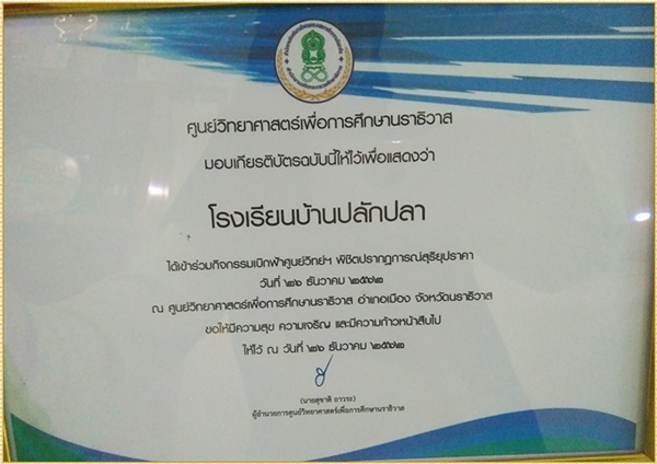 เมื่อวันที่ 26 ธันวาคม 2562 เวลา 08.30 น. นักเรียนชั้นประถมศึกษาปีที่ 4 - 5 โรงเรียนบ้านปลักปลา ได้เข้าร่วมกิจกรรมค่าย "เบิกฟ้าศูนย์วิทย์ ฯ พิชิตปรากฏการณ์สุริยุปราคา" ณ ศูนย์วิทยาศาสตร์เพื่อการศึกษานราธิวาส เพื่อให้นักเรียนร่วมสังเกตการณ์ปรากฏการณ์สุริยุปราคา เรียนรู้การใช้กล้องโทรทรรศน์เบื้องต้น การใช้แผนที่ดูดาว เพื่อส่งเสริมการเรียนรู้ร่วมกัน พัฒนาความคิดริเริ่มสร้างสรรค์เกี่ยวกับการเรียนทางวิทยาศาสตร์ และเพื่อสร้างเสริมประสบการณ์ตรงให้กับนักเรียนที่เพิ่มเติมจากการเรียนในห้องเรียน มีความรู้และประสบการณ์อย่างกว้างขวาง โดยมีกิจกรรมอาทิ กิจกรรมบรรยายท้องฟ้าโดยใช้โปรแกรมทางดาราศาสตร์ กิจกรรมทรงกลมท้องฟ้า กิจกรรมสังเกตการณ์ดวงอาทิตย์ผ่านกล้องจุลทรรศน์ ฯ บันทึกข้อมูลเมื่อ 27-12-2562