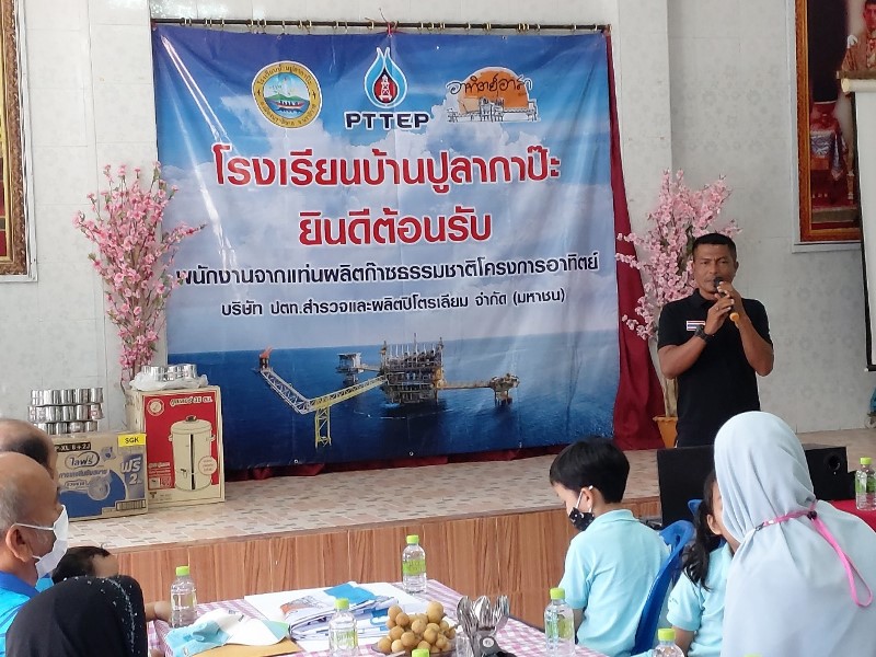 วันที่ 7 พฤศจิกายน 2563 นายกีรติ ป้อมบุญมี ผู้จัดการแท่นผลิตก๊าซธรรมชาติ โครงการอาทิตย์อาสาและคณะลงพื้นที่จัดโครงการอาทิตย์อาสาปีที่ 12 ศูนย์การเรียนรู้เศรษฐกิจพอเพียง ณ โรงเรียนบ้านปูลากาป๊ะ โดยมีนางสาวสุพิชญ์ สุขใส ผู้อำนวยการโรงเรียนบ้านปูลากาป๊ะ ผู้กำกับการสถานีตำรวจภูธรตันหยง ผบ.ร้อยปืนเล็กที่ 4 ฉก.นย.ทร. 33 ผู้ใหญ่บ้าน คณะครูและนักเรียนร่วมให้การต้อนรับ สำหรับการจัดโครงการอาทิตย์อาสาปีที่ 12 ศูนย์การเรียนรู้เศรษฐกิจพอเพียง ในครั้งนี้ โรงเรียนบ้านปูลากาป๊ะ ได้รับการคัดเลือกให้เข้าร่วมโครงการ ซึ่งการจัดกิจกรรมมีการมอบทุนจำนวน 150,000 บาท ให้กับโรงเรียนเพื่อสนับสนุนโครงการศูนย์การเรียนรู้เศรษฐกิจพอเพียงโรงเรียนบ้านปูลากาป๊ะ นอกจากนี้ได้มีการมอบทุนการศึกษาให้แก่นักเรียนที่เรียนดี จำนวน 18 ทุน ทุนละ 1,000 บาท พร้อมกระเป๋าเป้เด็กดีให้กับนักเรียนที่มีจิตอาสาช่วยเหลือโรงเรียนจำนวน 18 ใบ บันทึกข้อมูลเมื่อ 08-11-2563