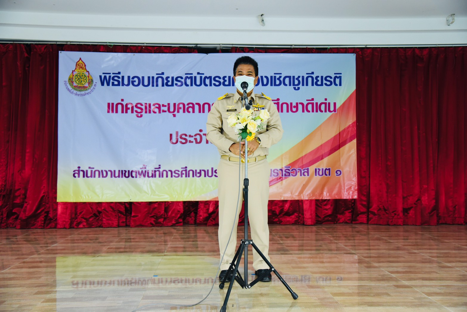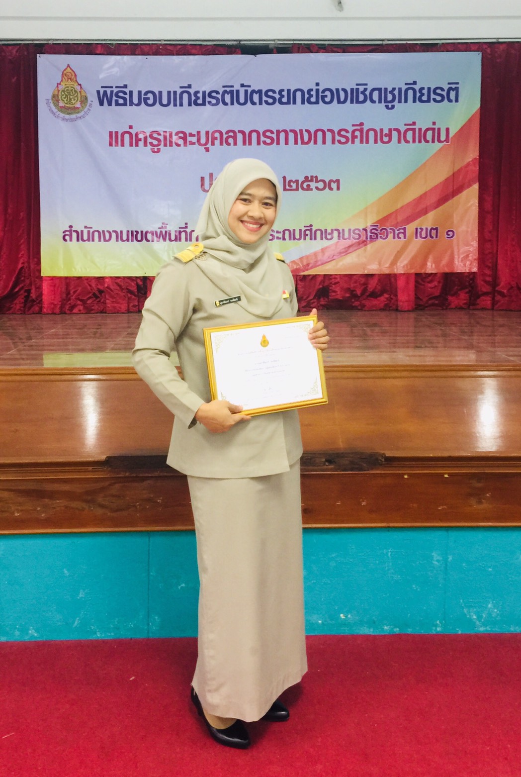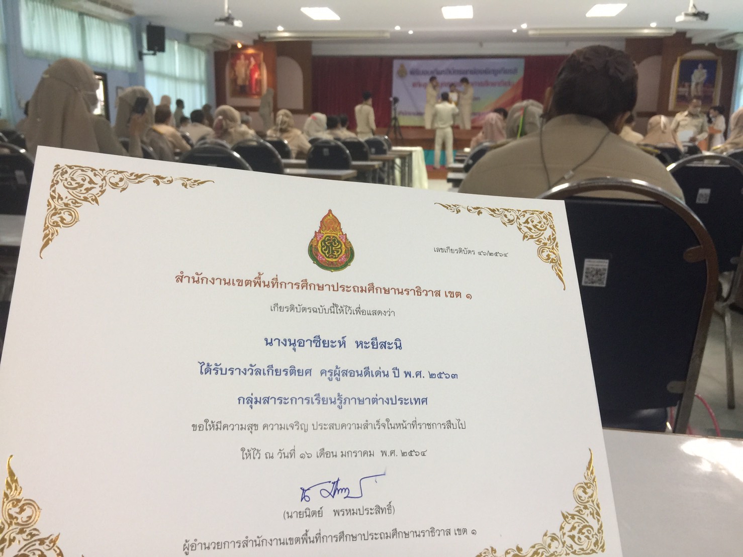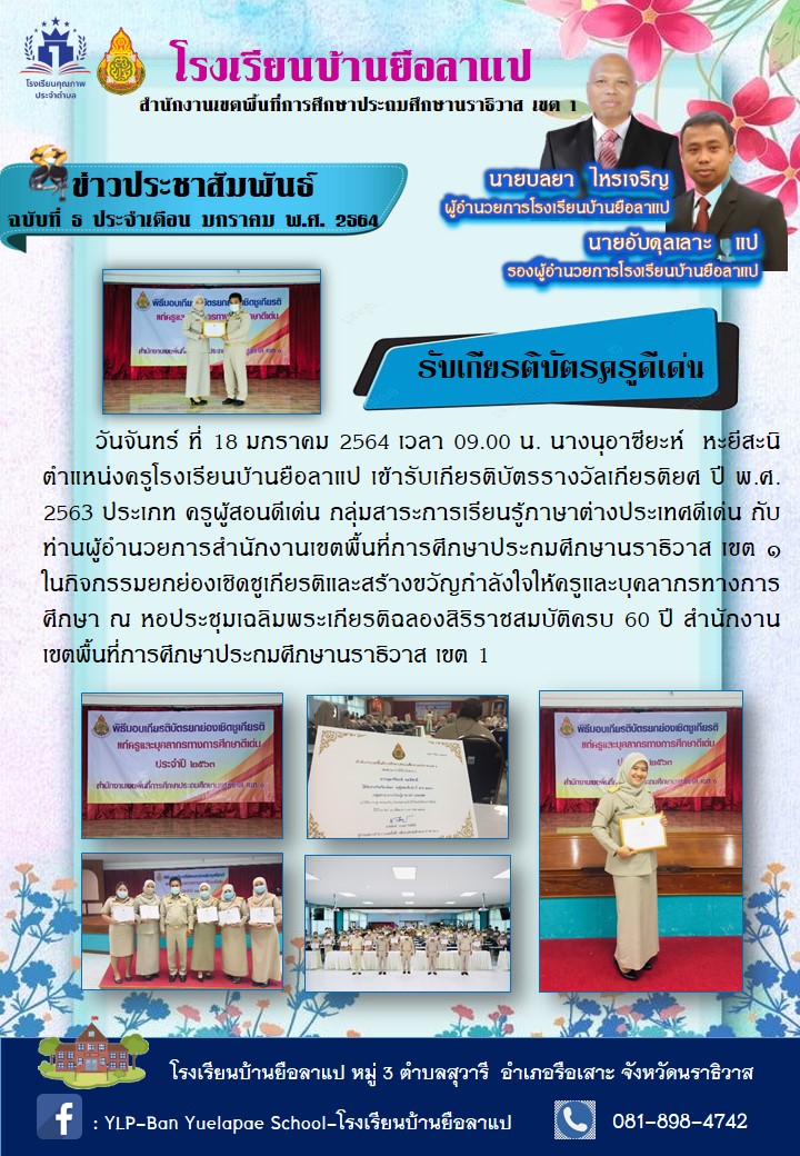 วันจันทร์ ที่ 18 มกราคม 2564 เวลา 09.00 น. นางนุอาซียะห์ หะยีสะนิ ตำแหน่งครูโรงเรียนบ้านยือลาแป เข้ารับเกียรติบัตรรางวัลเกียรติยศ ปี พ.ศ. 2563 ประเภท ครูผู้สอนดีเด่น กลุ่มสาระการเรียนรู้ภาษาต่างประเทศดีเด่น กับท่านผู้อำนวยการสำนักงานเขตพื้นที่การศึกษาประถมศึกษานราธิวาส เขต ๑ ในกิจกรรมยกย่องเชิดชูเกียรติและสร้างขวัญกำลังใจให้ครูและบุคลากรทางการศึกษา ณ หอประชุมเฉลิมพระเกียรติฉลองสิริราชสมบัติครบ 60 ปี สำนักงานเขตพื้นที่การศึกษาประถมศึกษานราธิวาส เขต 1