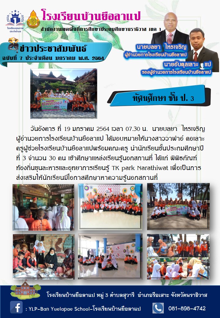 วันพุธ ที่ 20 มกราคม 2564 เวลา 13.30 น. นายบลยา ไหรเจริญ ผู้อำนวยการโรงเรียนบ้านยือลาแป ได้มอบหมายให้นายอับดุลเลาะ แป รองผู้อำนวยการโรงเรียนบ้านยือลาแป พร้อมคณะครู มอบถุงยังชีพที่ได้รับความอนุเคราะห์จาก สำนักพิมพ์อัซซาบิกูน ซึ่งประกอบด้วย ข้าวสาร อาหารแห้ง ให้แก่นักเรียนโรงเรียนบ้านยือลาแป สำนักงานเขตพื้นที่การศึกษาประถมศึกษานราธิวาส เขต 1 ที่เรียนดีและฐานะยากจน จำนวน 32 คน ขอขอบคุณ สำนักพิมพ์อัซซาบิกูน ที่มอบถุงยังชีพให้กับนักเรียนในครั้งนี้ด้วย