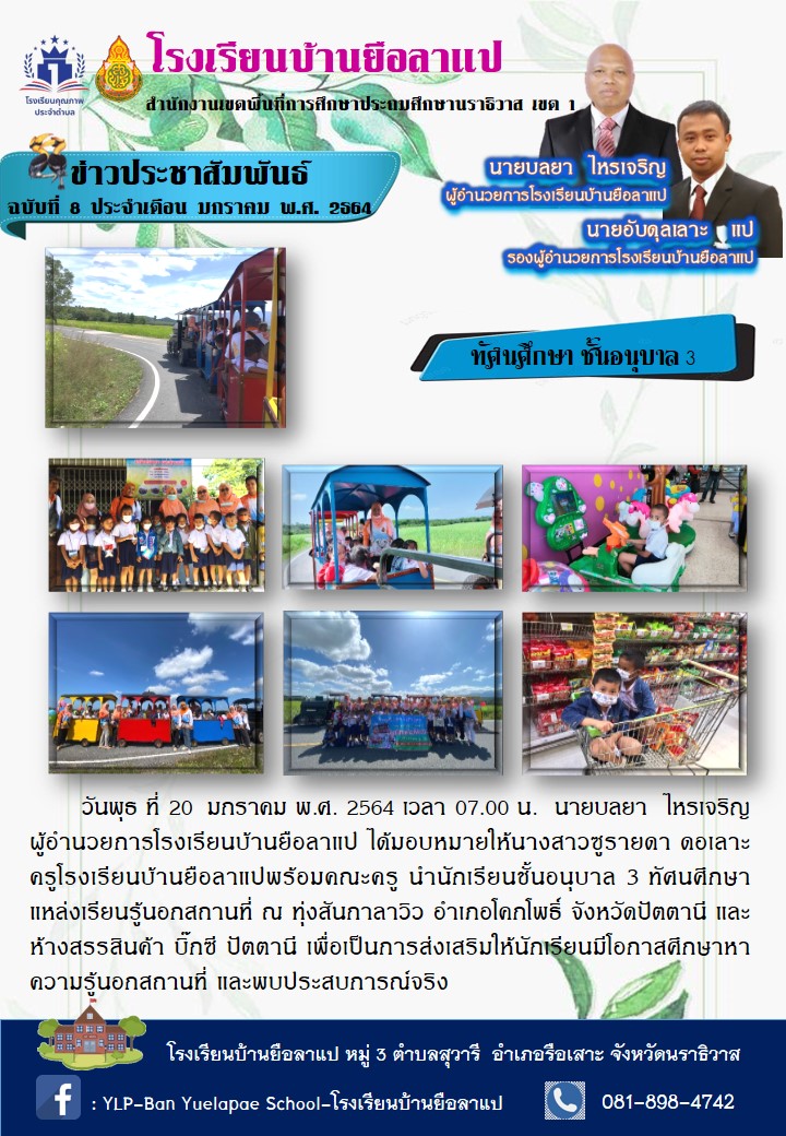 วันพุธ ที่ 20 มกราคม พ.ศ. 2564 เวลา 07.00 น. นายบลยา ไหรเจริญ ผู้อำนวยการโรงเรียนบ้านยือลาแป ได้มอบหมายให้นางสาวซูรายดา ดอเลาะ ครูโรงเรียนบ้านยือลาแปพร้อมคณะครู นำนักเรียนชั้นอนุบาล 3 ทัศนศึกษาแหล่งเรียนรู้นอกสถานที่ ณ ทุ่งสันกาลาวิว อำเภอโคกโพธิ์ จังหวัดปัตตานี และห้างสรรสินค้า บิ๊กซี ปัตตานี เพื่อเป็นการส่งเสริมให้นักเรียนมีโอกาสศึกษาหาความรู้นอกสถานที่ และพบประสบการณ์จริง