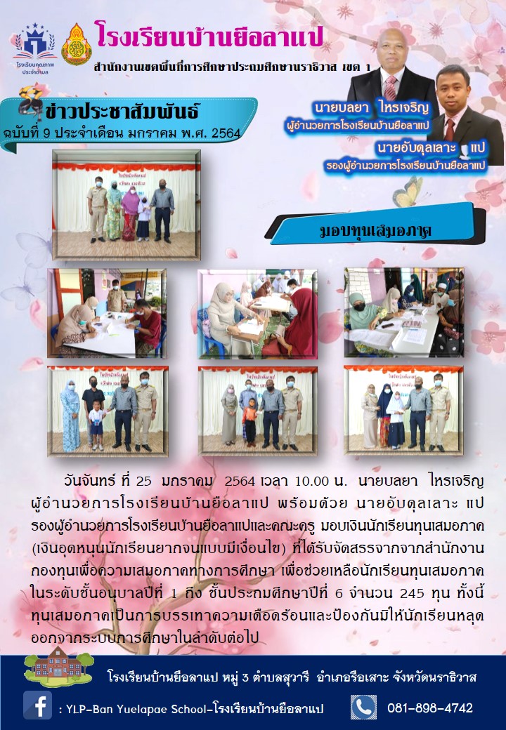 วันจันทร์ ที่ 25 มกราคม 2564 เวลา 10.00 น. นายบลยา ไหรเจริญ ผู้อำนวยการโรงเรียนบ้านยือลาแป พร้อมด้วย นายอับดุลเลาะ แป รองผู้อำนวยการโรงเรียนบ้านยือลาแป และคณะครู มอบเงินนักเรียนทุนเสมอภาค (เงินอุดหนุนนักเรียนยากจนแบบมีเงื่อนไข) ที่ได้รับจัดสรรจากจากสำนักงานกองทุนเพื่อความเสมอภาคทางการศึกษา เพื่อช่วยเหลือนักเรียนทุนเสมอภาคในระดับชั้นอนุบาลปีที่ 1 ถึง ชั้นประถมศึกษาปีที่ 6 จำนวน 245 ทุน การมอบทุนเสมอภาคเป็นการบรรเทาความเดือดร้อนและป้องกันมิให้นักเรียนหลุดออกจากระบบการศึกษาในลำดับต่อไป