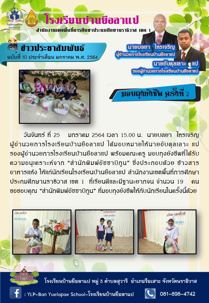 วันจันทร์ ที่ 25 มกราคม 2564 เวลา 15.00 น. นายบลยา ไหรเจริญ ผู้อำนวยการโรงเรียนบ้านยือลาแป ได้มอบหมายให้นายอับดุลเลาะ แป รองผู้อำนวยการโรงเรียนบ้านยือลาแป พร้อมคณะครู มอบถุงยังชีพที่ได้รับความอนุเคราะห์จาก สำนักพิมพ์อัซซาบิกูน ซึ่งประกอบด้วย ข้าวสาร อาหารแห้ง ให้แก่นักเรียนโรงเรียนบ้านยือลาแป สำนักงานเขตพื้นที่การศึกษาประถมศึกษานราธิวาส เขต 1 ที่เรียนดีและฐานะยากจน จำนวน 19 คน ขอขอบคุณ สำนักพิมพ์อัซซาบิกูน ที่มอบถุงยังชีพให้กับนักเรียนในครั้งนี้ด้วย