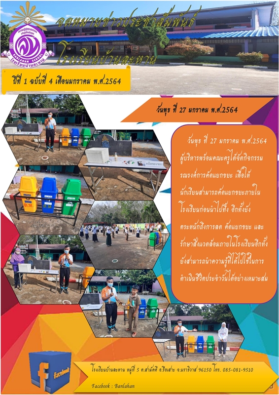 วันพุธ ที่ 27 มกราคม 2564 ทางโรงเรียนบ้านละหานได้จัดกิจกรรมรณรงค์การคัดแยกขยะ เพื่อให้นักเรียนสามารถคัดแยกขยะภายในโรงเรียนก่อนนำไปทิ้งและตระหนักถึงการลด คัดแยกขยะ และรักษาสิ่งแวดล้อมภายในโรงเรียน สามารถนำความรู้ที่ได้ไปใช้ในการดำเนินชีวิตประจำวันได้อย่างเหมาะสม บันทึกข้อมูลเมื่อ 27-01-2564