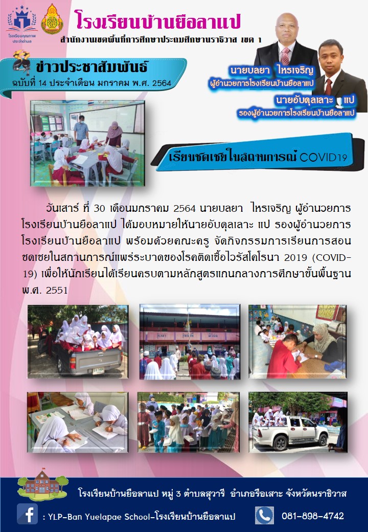 วันเสาร์ ที่ 30 เดือนมกราคม 2564 นายบลยา ไหรเจริญ ผู้อำนวยการโรงเรียนบ้านยือลาแป ได้มอบหมายให้นายอับดุลเลาะ แป รองผู้อำนวยการโรงเรียนบ้านยือลาแป พร้อมด้วยคณะครู จัดกิจกรรมการเรียนการสอนชดเชยในสถานการณ์แพร่ระบาดของโรคติดเชื้อไวรัสโคโรนา 2019 (COVID-19) เพื่อให้นักเรียนได้เรียนครบตามหลักสูตรแกนกลางการศึกษาขั้นพื้นฐาน พ.ศ. 2551