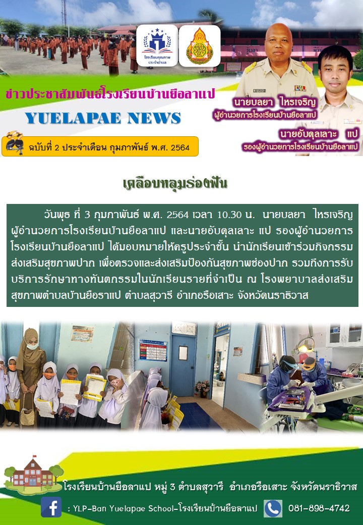 วันพุธ ที่ 3 กุมภาพันธ์ พ.ศ. 2564 เวลา 10.30 น. นายบลยา ไหรเจริญ ผู้อำนวยการโรงเรียนบ้านยือลาแป และนายอับดุลเลาะ แป รองผู้อำนวยการโรงเรียนบ้านยือลาแป ได้มอบหมายให้ครูประจำชั้น นำนักเรียนเข้าร่วมกิจกรรมส่งเสริมสุขภาพปาก เพื่อตรวจและส่งเสริมป้องกันสุขภาพช่องปาก รวมถึงการรับบริการรักษาทางทันตกรรมในนักเรียนรายที่จำเป็น ณ โรงพยาบาลส่งเสริมสุขภาพตำบลบ้านยือราแป ตำบลสุวารี อำเภอรือเสาะ จังหวัดนราธิวาส