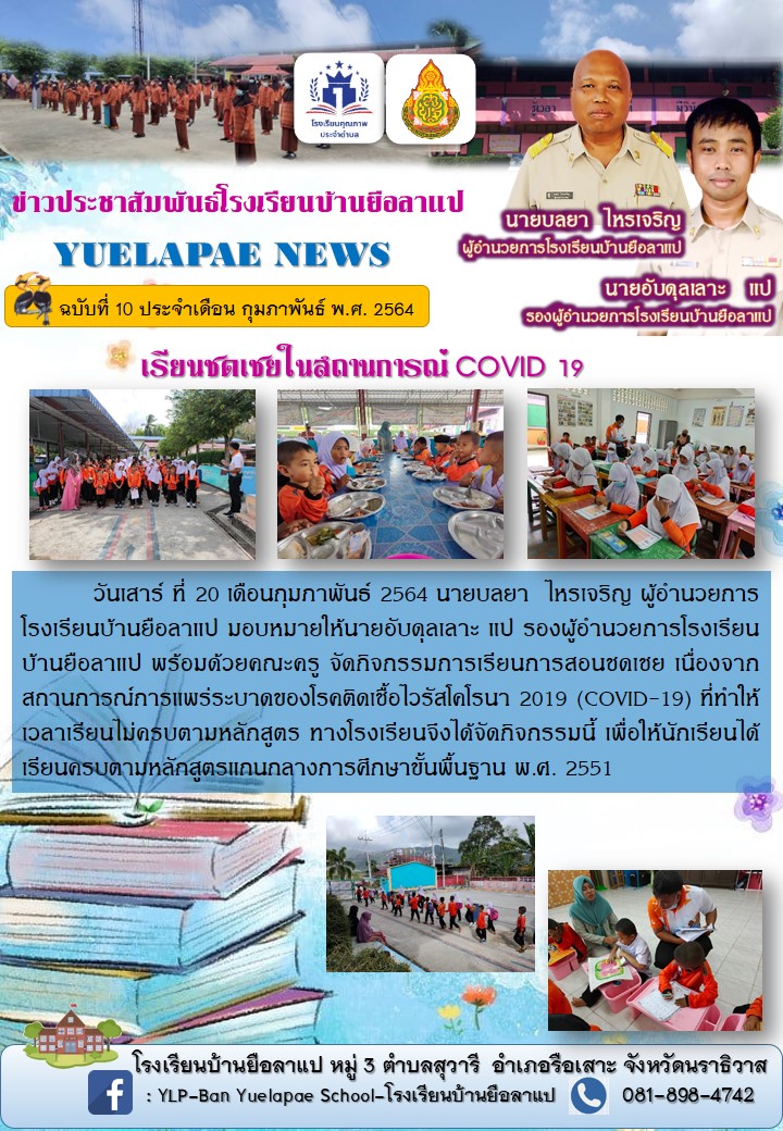 วันเสาร์ ที่ 20 เดือนกุมภาพันธ์ 2564 นายบลยา ไหรเจริญ ผู้อำนวยการโรงเรียนบ้านยือลาแป มอบหมายให้นายอับดุลเลาะ แป รองผู้อำนวยการโรงเรียนบ้านยือลาแป พร้อมด้วยคณะครู จัดกิจกรรมการเรียนการสอนชดเชย เนื่องจากสถานการณ์การแพร่ระบาดของโรคติดเชื้อไวรัสโคโรนา 2019 (COVID-19) ที่ทำให้เวลาเรียนไม่ครบตามหลักสูตร ทางโรงเรียนจึงได้จัดกิจกรรมนี้ เพื่อให้นักเรียนได้เรียนครบตามหลักสูตรแกนกลางการศึกษาขั้นพื้นฐาน พ.ศ. 2551