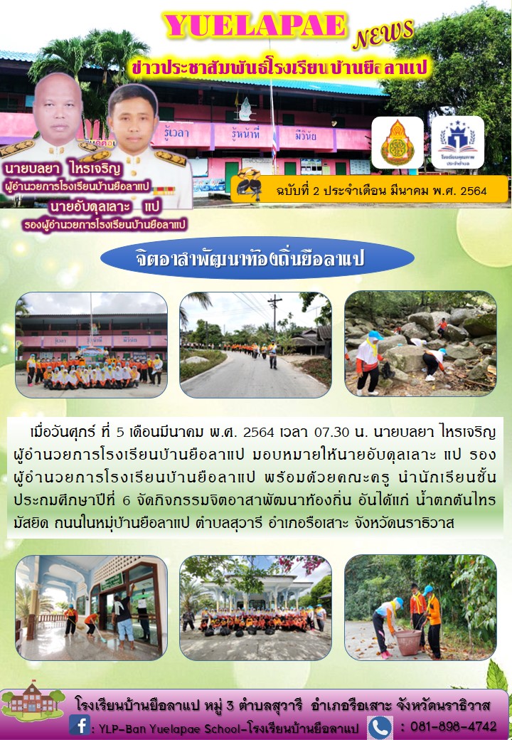 วันศุกร์ ที่ 5 เดือนมีนาคม พ.ศ. 2564 เวลา 07.30 น. นายบลยา ไหรเจริญ ผู้อำนวยการโรงเรียนบ้านยือลาแป มอบหมายให้นายอับดุลเลาะ แป รองผู้อำนวยการโรงเรียนบ้านยือลาแป พร้อมด้วยคณะครู นำนักเรียนชั้นประถมศึกษาปีที่ 6 จัดกิจกรรมจิตอาสาพัฒนาท้องถิ่น อันได้แก่ น้ำตกต้นไทร มัสยิด ถนนในหมุ่บ้านยือลาแป ตำบลสุวารี อำเภอรือเสาะ จังหวัดนราธิวาส บันทึกข้อมูลเมื่อ 17-05-2564
