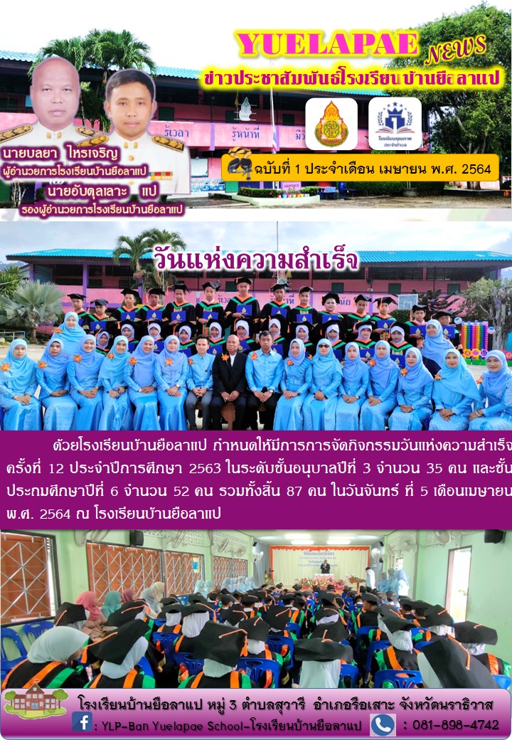 ด้วยโรงเรียนบ้านยือลาแป กำหนดให้มีการการจัดกิจกรรมวันแห่งความสำเร็จ ครั้งที่ 12 ประจำปีการศึกษา 2563 ในระดับชั้นอนุบาลปีที่ 3 จำนวน 35 คน และชั้นประถมศึกษาปีที่ 6 จำนวน 52 คน รวมทั้งสิ้น 87 คน ในวันจันทร์ ที่ 5 เดือนเมษายน พ.ศ. 2564 ณ โรงเรียนบ้านยือลาแป