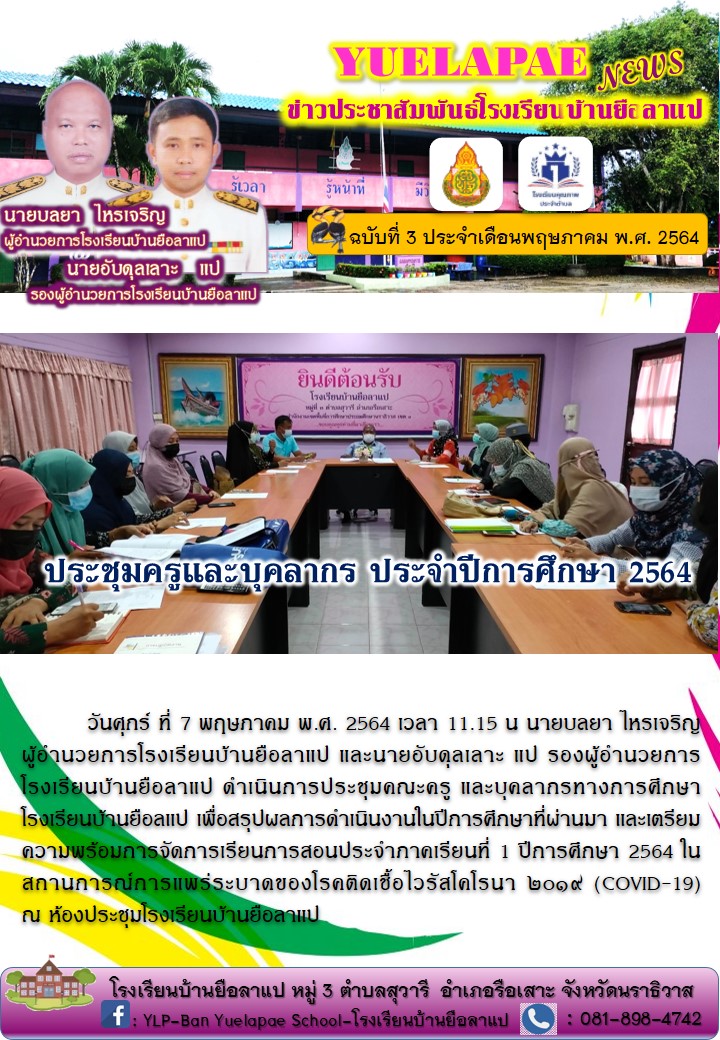 วันศุกร์ ที่ 7 พฤษภาคม พ.ศ. 2564 เวลา 11.15 น นายบลยา ไหรเจริญ ผู้อำนวยการโรงเรียนบ้านยือลาแป และนายอับดุลเลาะ แป รองผู้อำนวยการโรงเรียนบ้านยือลาแป ดำเนินการประชุมคณะครู และบุคลากรทางการศึกษาโรงเรียนบ้านยือลแป เพื่อสรุปผลการดำเนินงานในปีการศึกษาที่ผ่านมา และเตรียมความพร้อมการจัดการเรียนการสอนประจำภาคเรียนที่ 1 ปีการศึกษา 2564 ในสถานการณ์การแพร่ระบาดของโรคติดเชื้อไวรัสโคโรนา ๒o๑๙ (COVID-19) ณ ห้องประชุมโรงเรียนบ้านยือลาแป