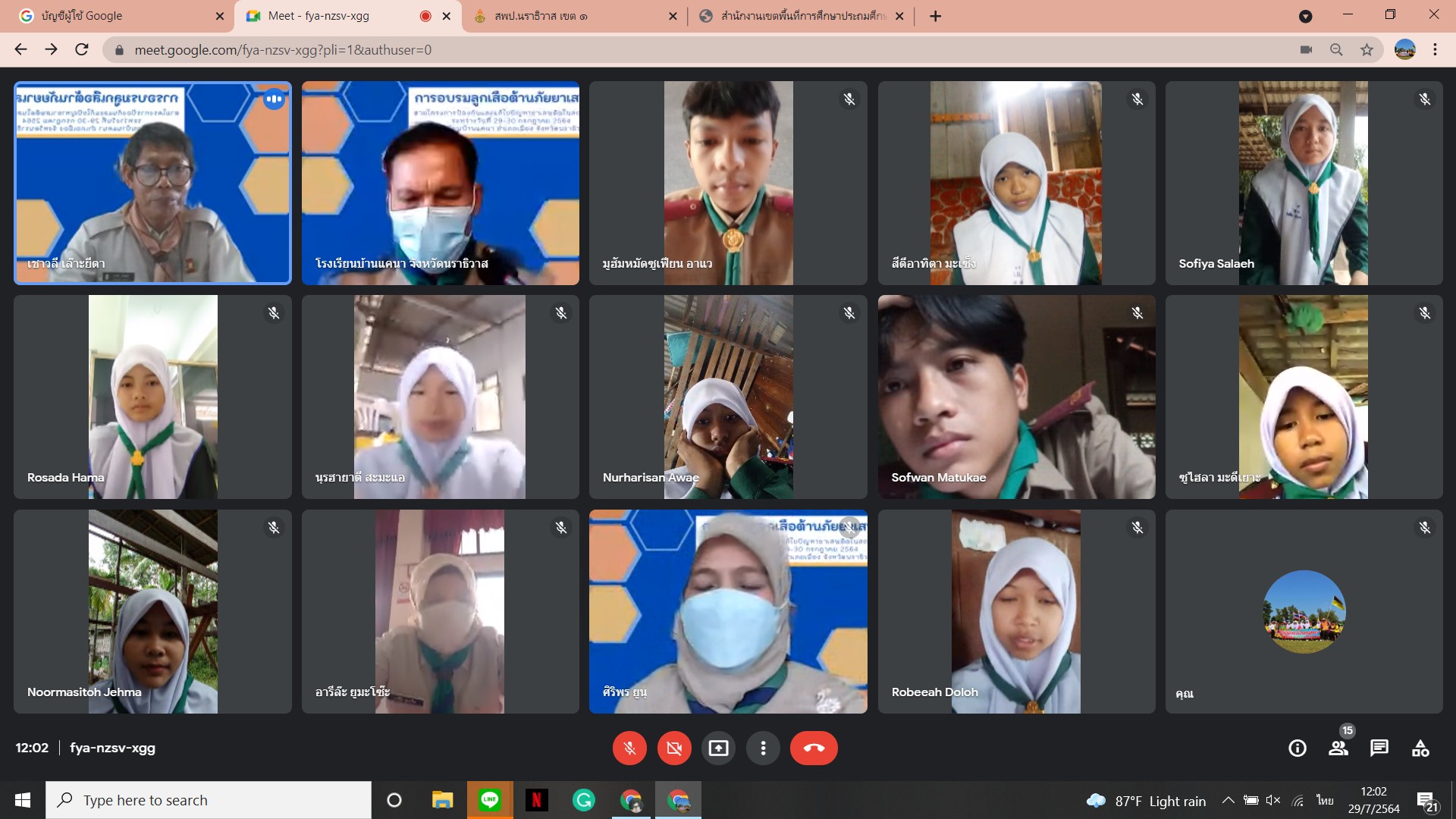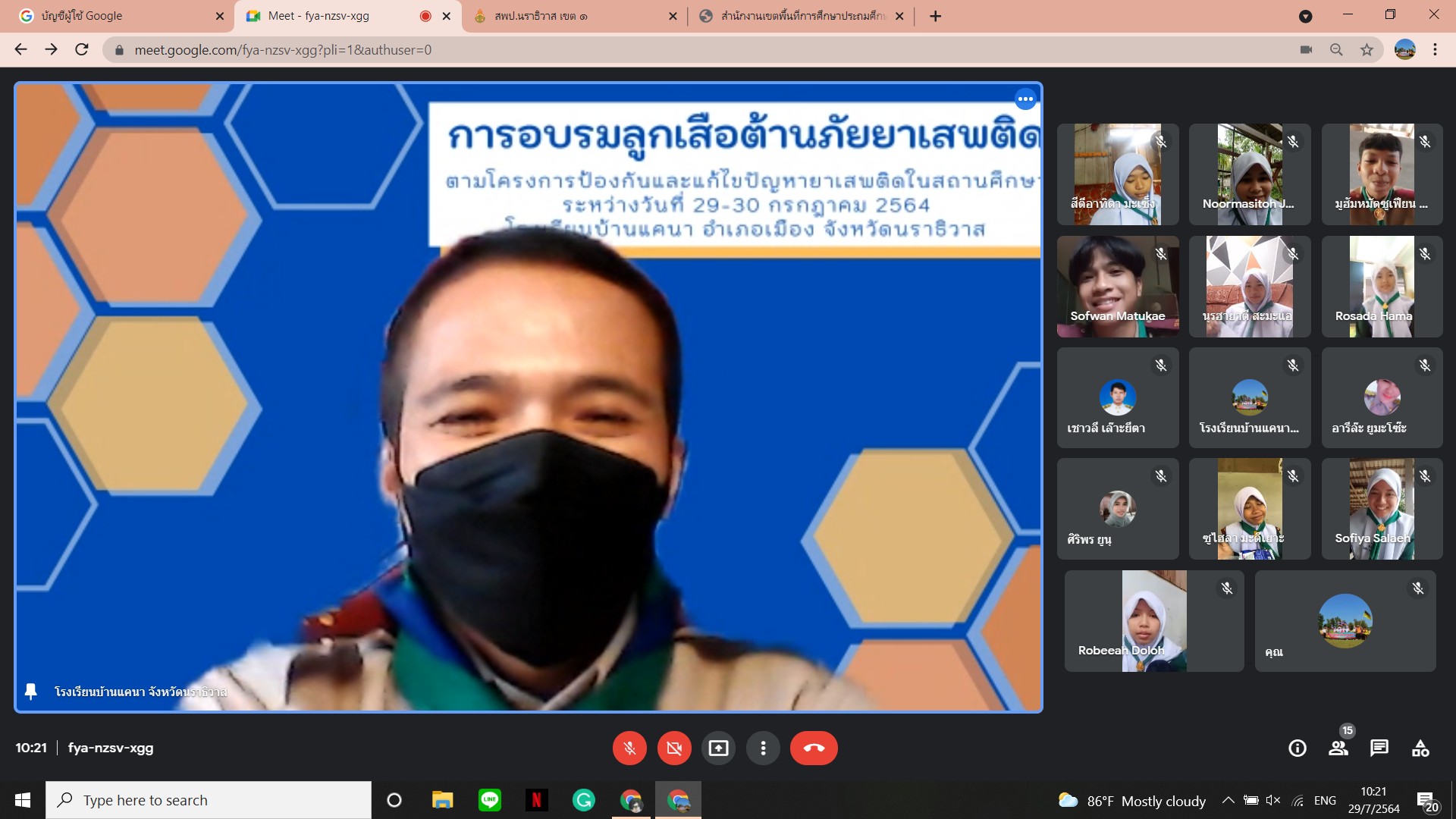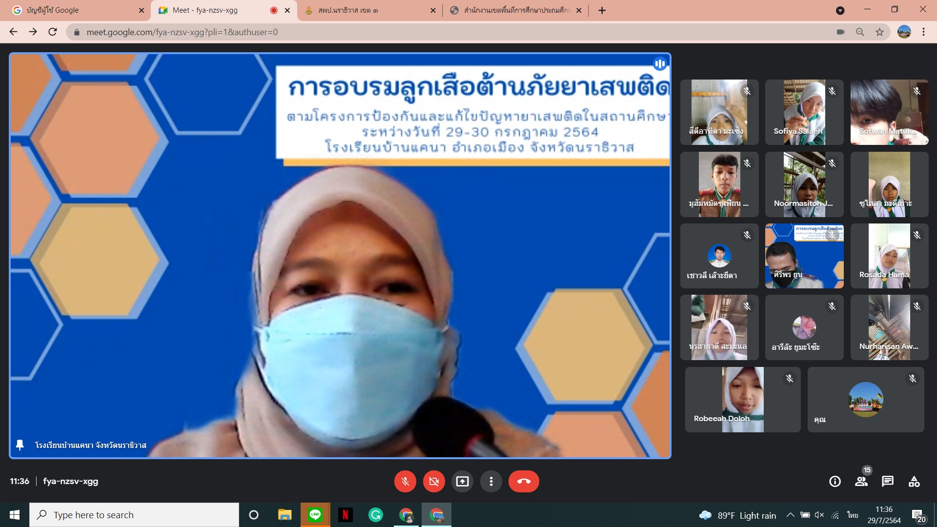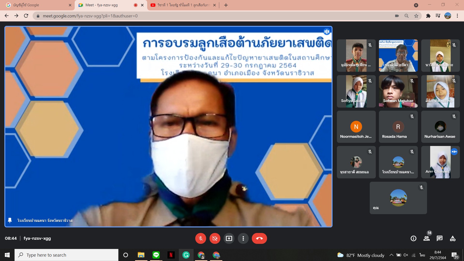 นายเชาวลี เล๊าะยีตา ผู้อำนวยการโรงเรียนบ้านแคนา พร้อมคณะครูโรงเรียนบ้านแคนา ดำเนินการจัดกิจกรรมอบรมลูกเสือต้านยาเสพติด ประจำปีการศึกษา ๒๕๖๔ ให้กับนักเรียนชั้นมัธยมศึกษาตอนต้น จำนวน ๘ คน ผ่านระบบ Google meet โดยถ่ายทอดสัญญาณจากห้องประชุมโรงเรียนบ้านแคนา ต.บางปอ อ.เมืองฯ จ.นราธิวาส ระหว่างวันที่ ๒๙ - ๓๐ กรกฎาคม ๒๕๖๔