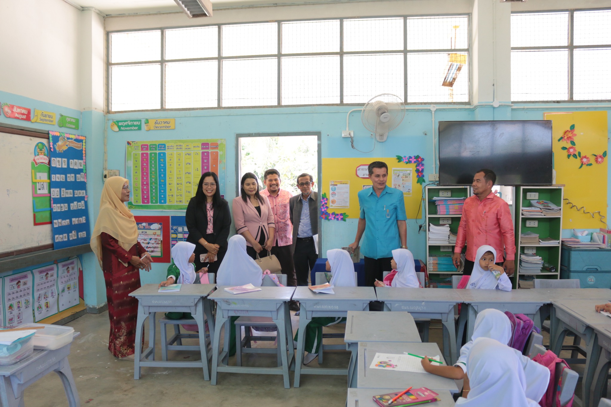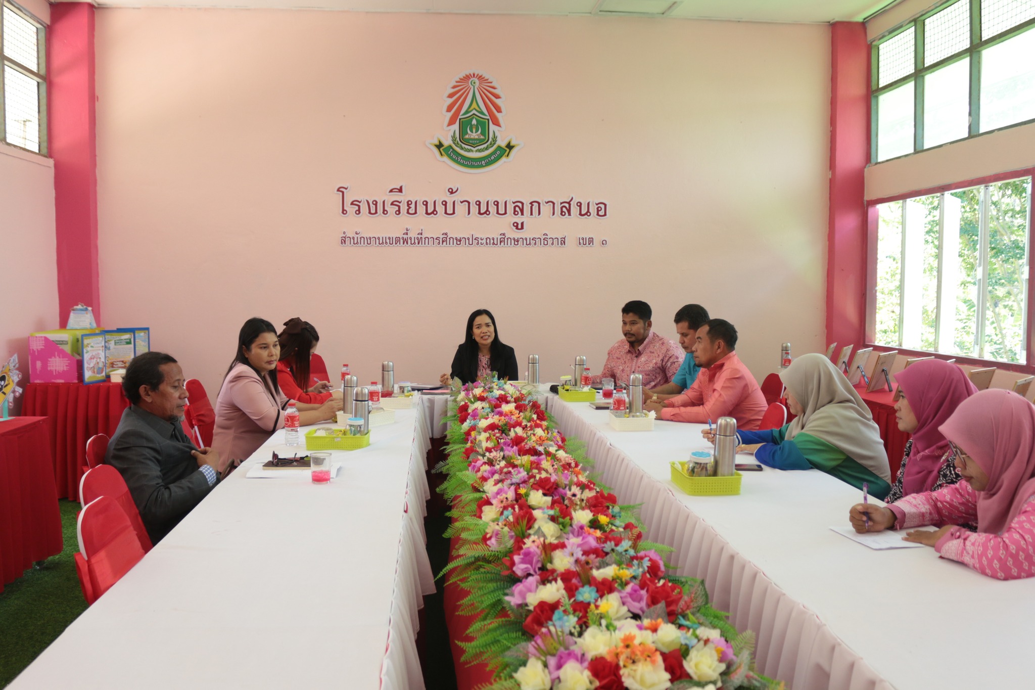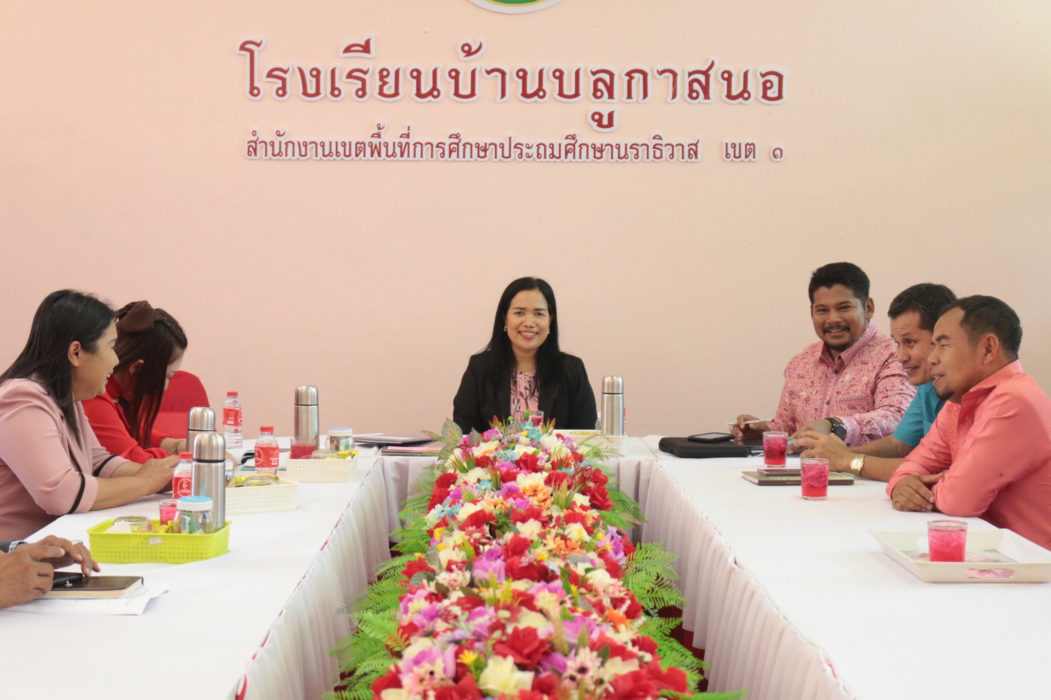 นายนริศ นิมอ ผู้อำนวยการโรงเรียนบ้านบลูกาสนอ พร้อมด้วยคณะครูและบุคลากรทางการศึกษา ร่วมต้อนรับ นางศิริพร ใจห้าว รองผอ.สพป.นราธิวาส.เขต1