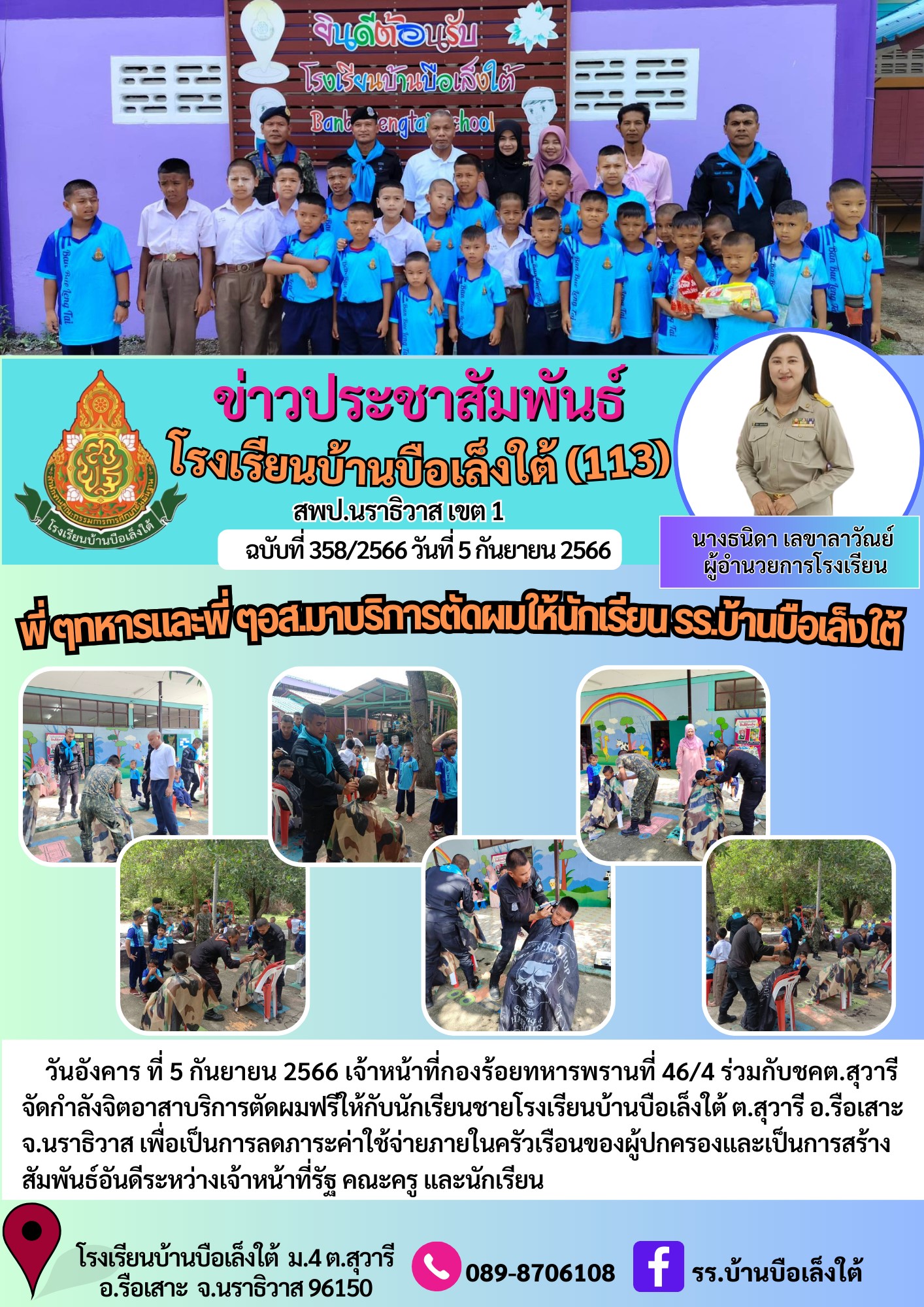 ÇѹÍѧ¤Òà ·Õè 5 ¡Ñ¹ÂÒ¹ 2566 à¨éÒ˹éÒ·Õè¡Í§ÃéÍ·ËÒþÃÒ¹·Õè 46/4 ÃèÇÁ¡Ñºª¤µ.ÊØÇÒÃÕ ¨Ñ´¡ÓÅѧ¨ÔµÍÒÊÒºÃÔ¡ÒõѴ¼Á¿ÃÕãËé¡Ñº¹Ñ¡àÃÕ¹ªÒÂâçàÃÕ¹ºéÒ¹º×ÍàÅç§ãµé µ.ÊØÇÒÃÕ Í.Ã×ÍàÊÒÐ ¨.¹ÃÒ¸ÔÇÒÊ à¾×èÍà»ç¹¡ÒÃÅ´ÀÒÃФèÒãªé¨èÒÂÀÒÂ㹤ÃÑÇàÃ×͹¢Í§¼Ù黡¤ÃͧáÅÐà»ç¹¡ÒÃÊÃéÒ§ÊÑÁ¾Ñ¹¸ìÍѹ´ÕÃÐËÇèÒ§à¨éÒ˹éÒ·ÕèÃѰ ¤³Ð¤ÃÙ áÅйѡàÃÕ¹ ºÑ¹·Ö¡¢éÍÁÙÅàÁ×èÍ 05-09-2566