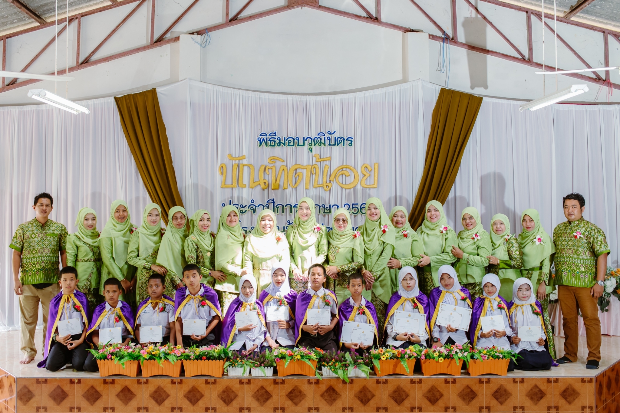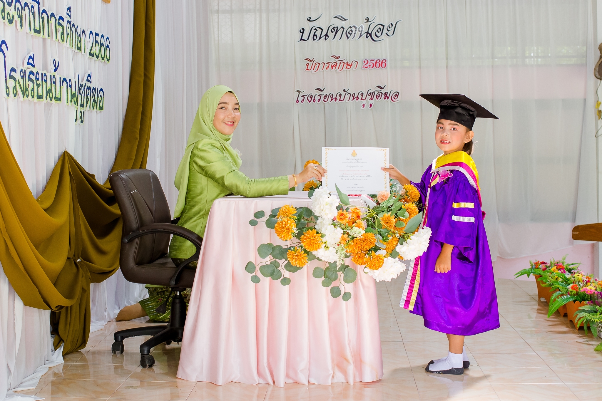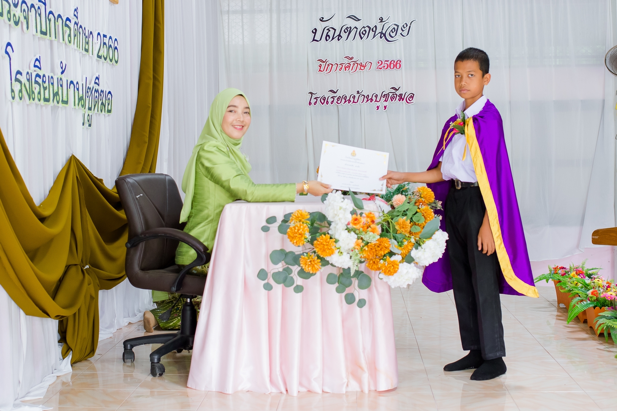 วันที่ 8 มีนาคม 2567 นางสาวมารีนา เนตรไมตรี ผู้อำนวยการโรงเรียนบ้านปูซูตีฆอและคณะครูร่วมดำเนินกิจกรรมบัณฑิตน้อย ประจำปีการศึกษา2566 เพื่อร่วมยินดีแก่นักเรียนชั้นประถมศึกษาปีที่ 6 และอนุบาล3 ที่สำเร็จการศึกษาและมอบเกียรติบัตรแก่นักเรียนดีเด่น เพื่อเป็นขวัญและกำลังใจให้แก่นักเรียน ณ อาคารอเนกประสงค์โรงเรียนบ้านปูซูตีฆอ บันทึกข้อมูลเมื่อ 31-03-2567