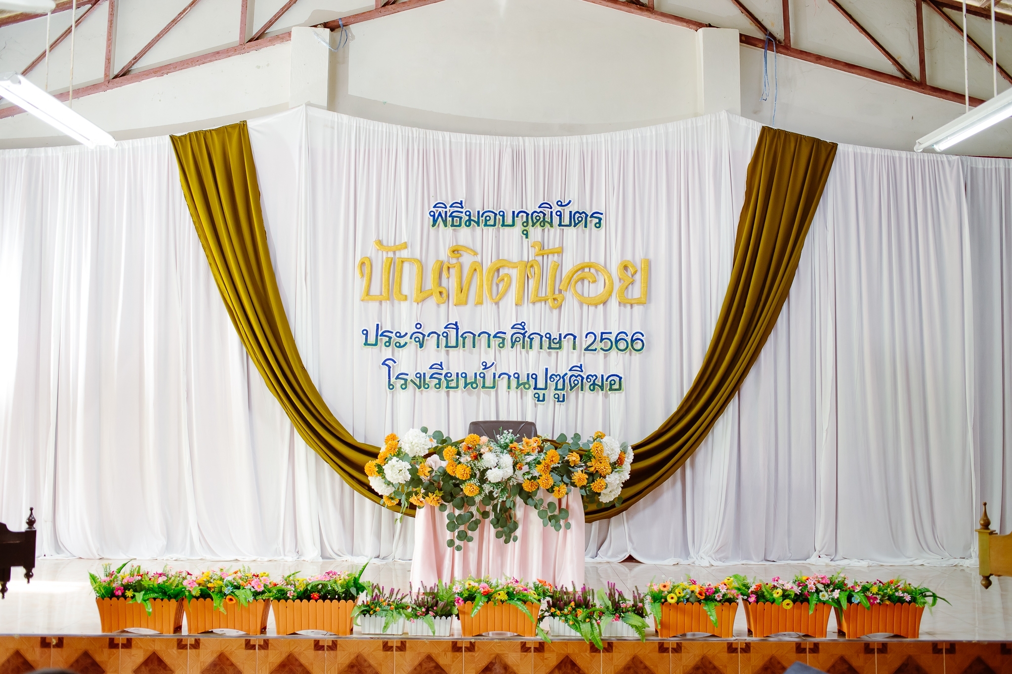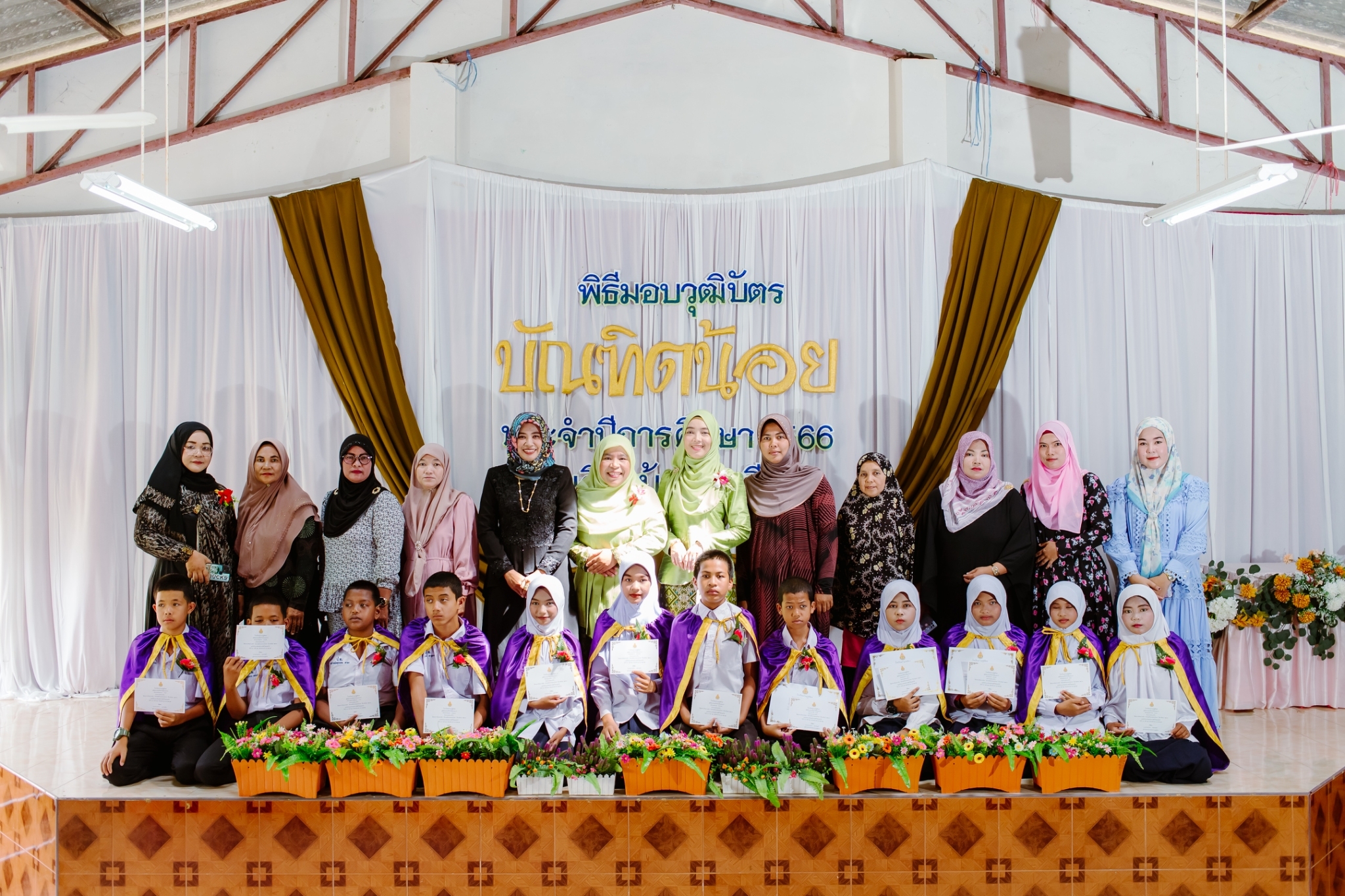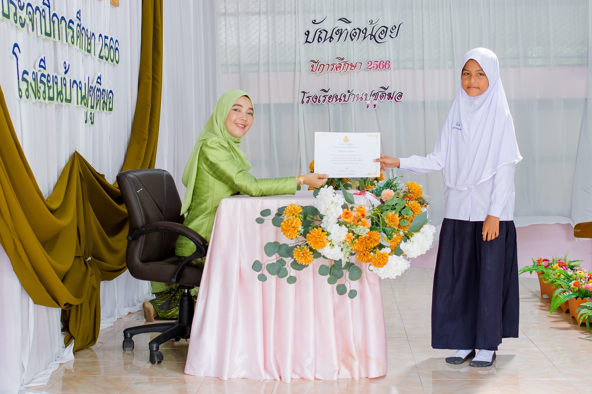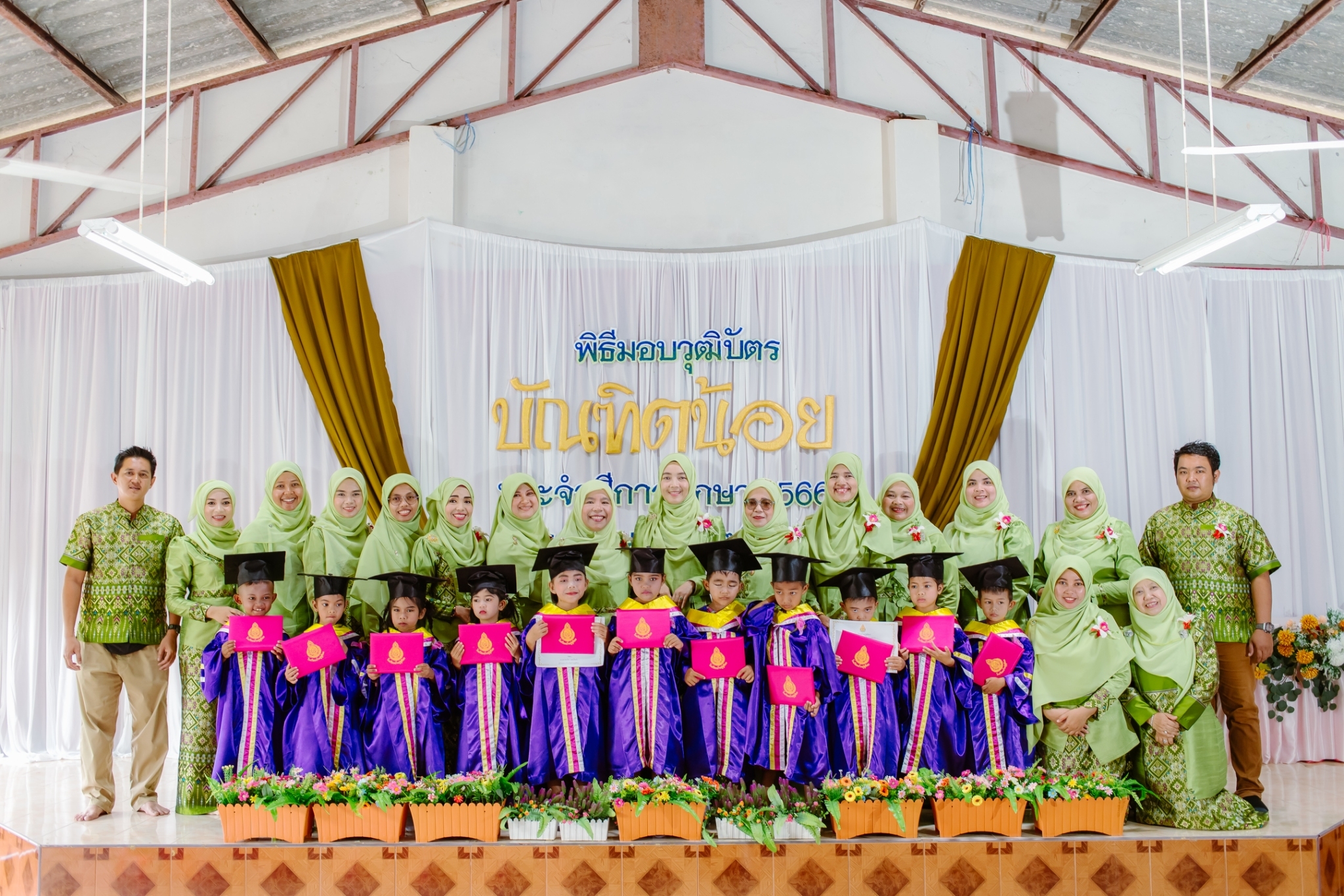 วันที่ 8 มีนาคม 2567 นางสาวมารีนา เนตรไมตรี ผู้อำนวยการโรงเรียนบ้านปูซูตีฆอและคณะครูร่วมดำเนินกิจกรรมบัณฑิตน้อย ประจำปีการศึกษา2566 เพื่อร่วมยินดีแก่นักเรียนชั้นประถมศึกษาปีที่ 6 และอนุบาล3 ที่สำเร็จการศึกษาและมอบเกียรติบัตรแก่นักเรียนดีเด่น เพื่อเป็นขวัญและกำลังใจให้แก่นักเรียน ณ อาคารอเนกประสงค์โรงเรียนบ้านปูซูตีฆอ บันทึกข้อมูลเมื่อ 31-03-2567