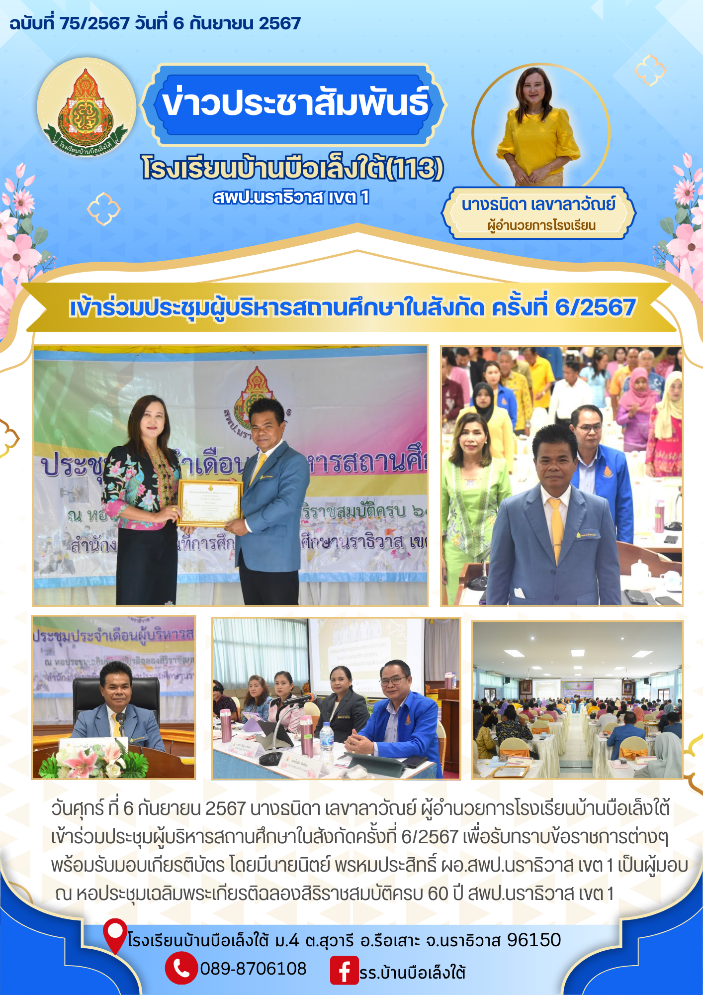 ÇÑ¹ÈØ¡Ãì ·Õè 6 ¡Ñ¹ÂÒ¹ 2567 ¹Ò§¸¹Ô´Ò àÅ¢ÒÅÒÇѳÂì ¼ÙéÍӹǡÒÃâçàÃÕ¹ºéÒ¹º×ÍàÅç§ãµé à¢éÒÃèÇÁ»ÃЪØÁ¼ÙéºÃÔËÒÃʶҹÈÖ¡ÉÒã¹Êѧ¡Ñ´¤ÃÑé§·Õè 6/2567 à¾×èÍÃѺ·ÃÒº¢éÍÃÒª¡ÒõèÒ§æ ¾ÃéÍÁÃѺÁͺà¡ÕÂõԺѵà â´ÂÁÕ¹Ò¹ԵÂì ¾ÃËÁ»ÃÐÊÔ·¸Ôì ¼Í.ʾ».¹ÃÒ¸ÔÇÒÊ à¢µ 1 à»ç¹¼ÙéÁͺ ³ ËÍ»ÃЪØÁà©ÅÔÁ¾ÃÐà¡ÕÂõԩÅͧÊÔÃÔÃÒªÊÁºÑµÔ¤Ãº 60 »Õ ʾ».¹ÃÒ¸ÔÇÒÊ à¢µ 1 ºÑ¹·Ö¡¢éÍÁÙÅàÁ×èÍ 06-09-2567