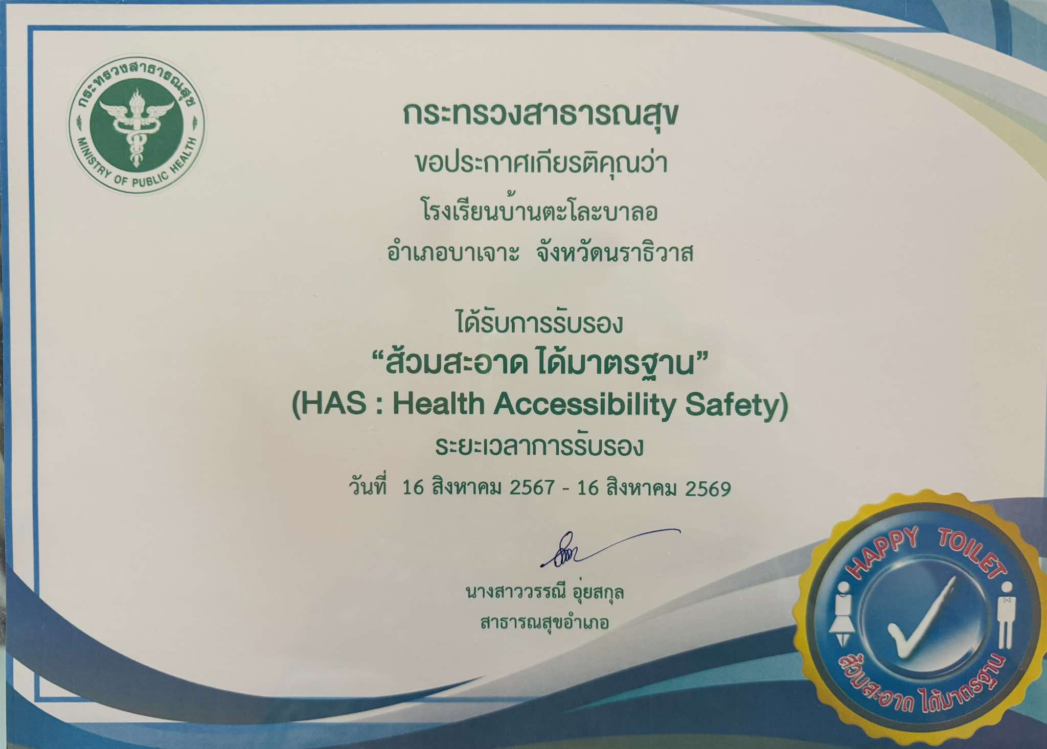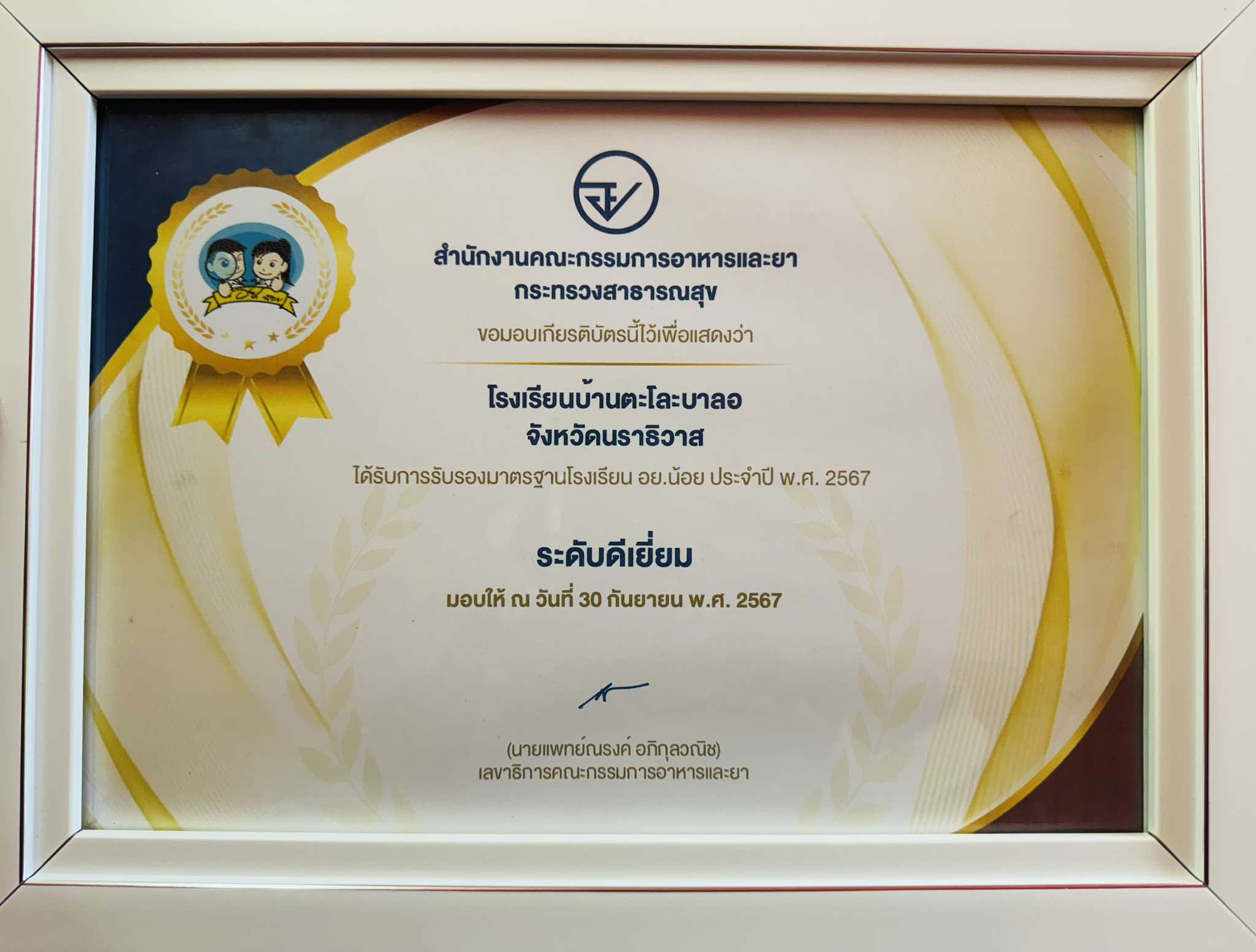 วันที่ 6 พฤศจิกายน พ.ศ.2567 นางดาวเรือง เจ๊ะมะ ผู้อำนวยการโรงเรียนบ้านตะโละบาลอ พร้อมด้วย นางนิธิวดี เหมเหาะ นางสาวกรรนิการ์ รือสะ และนางสาวซูไวบะห์ สาแม เข้ารับรางวัล โรงเรียน อย.น้อย ประจำปี 2567 ระดับดีเยี่ยม และรางวัลโรงเรียน ส้วมสะอาด ได้มาตรฐาน HAS ณ ห้องประชุมกาญจนาภิเษก ที่ว่าการอำเภอบาเจาะ โดยมีนายประภาส หมีดเส็น เป็นประธานมอบเกียรติบัตร