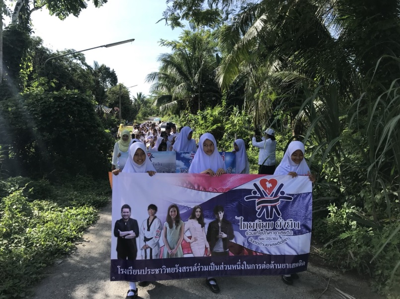 ผู้บริหาร คณะครู นักเรียน ผู้ปกครองและหน่วยงานที่เกี่ยวข้องร่วมเดินรณรงค์วันต่อต้านยาเสพติดโลก นำโดยขบวนกองยาว คณะนางรำ และขบวนผู้เข้าร่วมกิจกรรมดังกล่าว